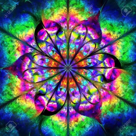 Abstract entgeogenic flower mandala in rainbow colours.